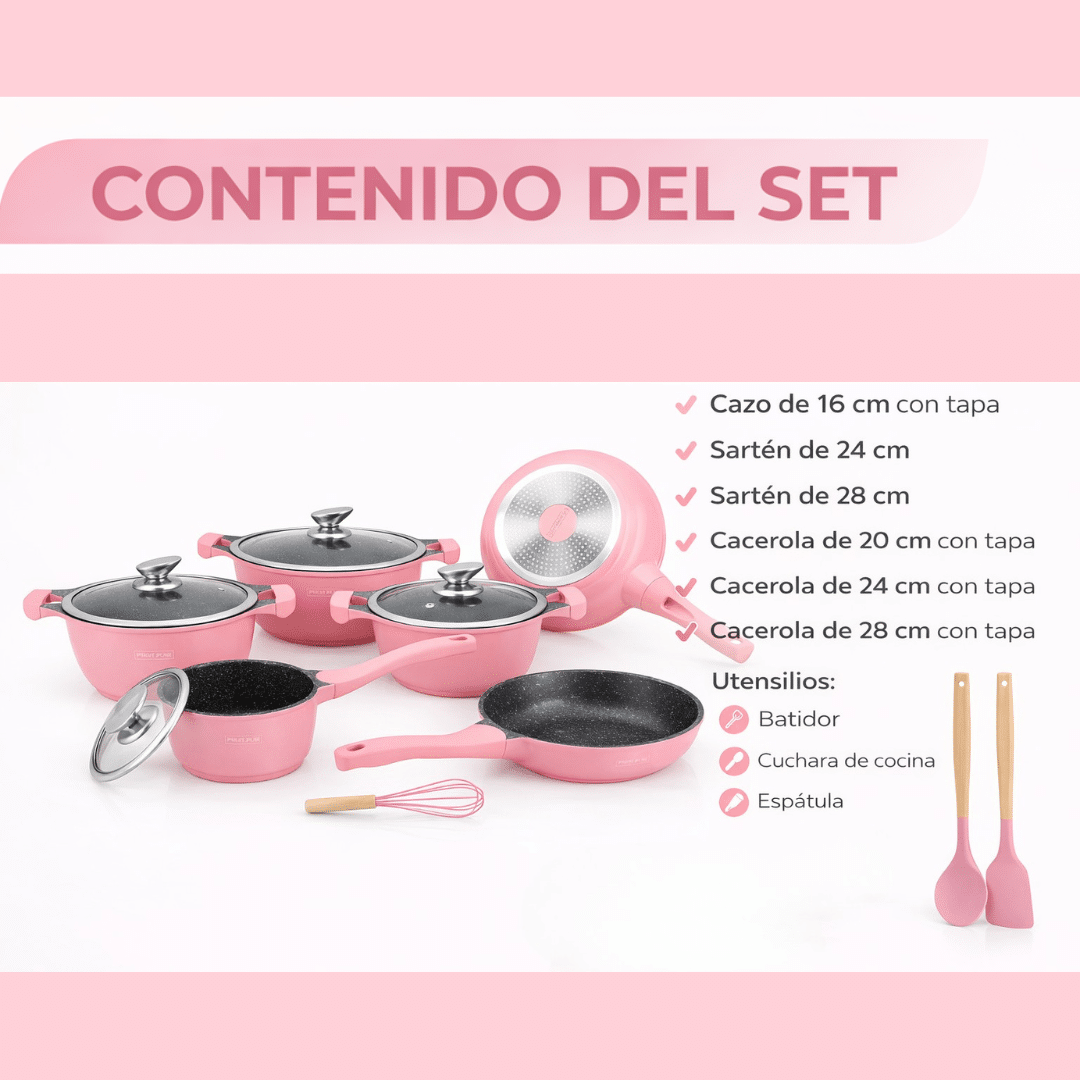 • 1× Batería de Cocina Rosa Royalty Line (13 piezas): Aluminio Fundido y Antiadherente de Mármol
